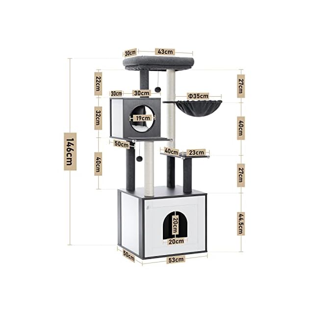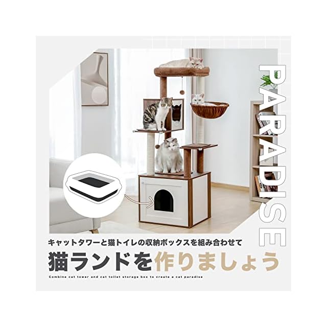 PETEPELA(ぺテぺラ) キャットタワー トイレ目隠し 木製 収納 多用家具 インテリア 猫タワー 多頭 安全対策 滑り止めマット付き 猫ハウス ベッド - 高さ150cm ベージュ