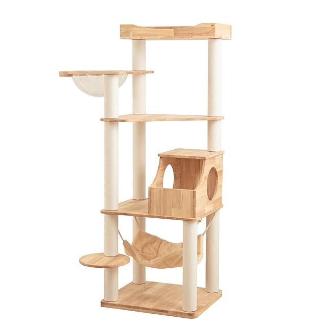 PETTIFUL キャットタワー 木製 据え置き おしゃれ 高さ162cm 多頭飼い 登りやすい 見晴台 スリム 猫タワー 左右反転可能 宇宙船 大型猫 シニア 爪研ぎ キャットツリー クリアボウル 隠れ家左右変更取付 安定 運動不足解消 インテリア シンプル (濃い(ワックス塗り))