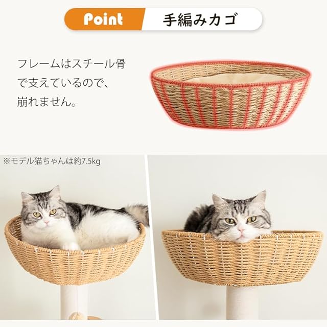 【耐久性と安定感】オランダベルベット張りの重厚な木製ボードで、どっしりとした安定感を実現しました。猫ちゃんが勢いよく飛び降りても倒れません。手編みのカゴは内部にスチールフレームを備えているため、長年ご使用いただいても型崩れせず、安心してお使いいただけます。
