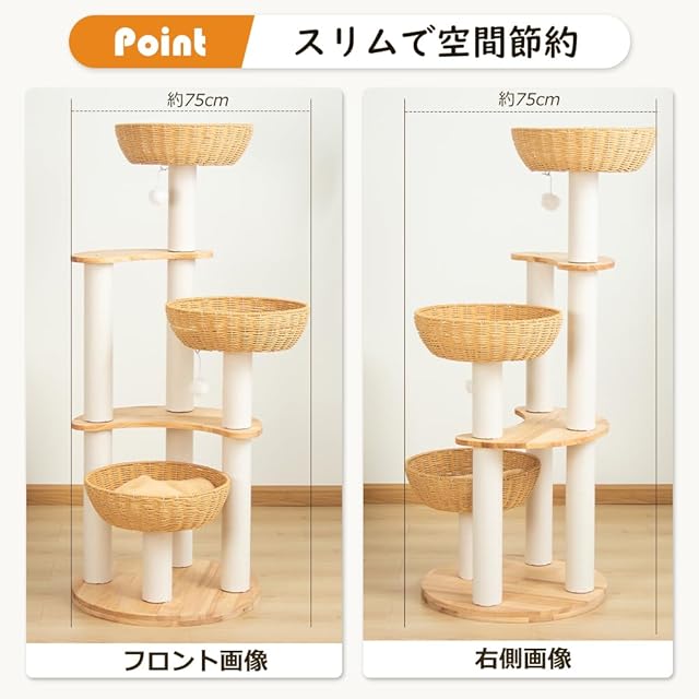 【耐久性と安定感】家具によく使用される重厚なラバーウッドを採用し、どっしりとした安定感を実現しました。猫ちゃんが勢いよく飛び降りても倒れません。手編みのカゴは内部にスチールフレームを備えているため、長年ご使用いただいても型崩れせず、安心してお使いいただけます。