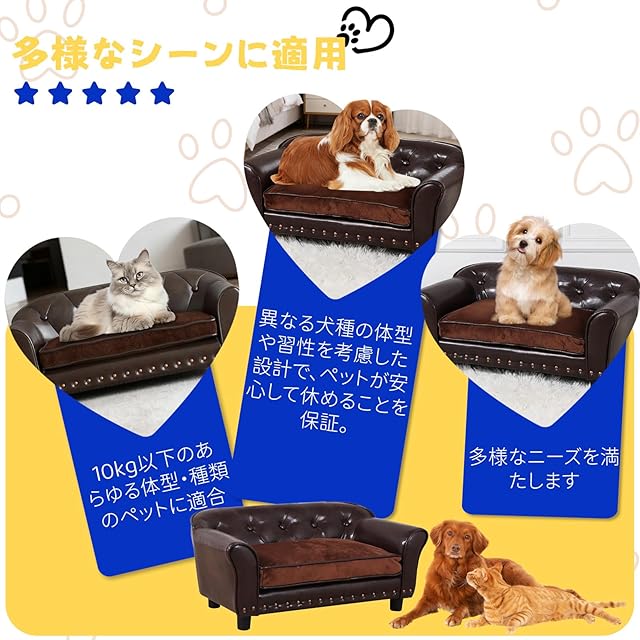 NODIBRO ペットベッド 頑丈 ペット用ソファ 74*41cm 小型犬 猫椅子ベッド 犬寝床 合成皮革 おしゃれ かわいい ふわふわ 高級 防水 滑り止め 通年使用 猫 犬 多頭飼い ブラウン