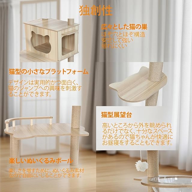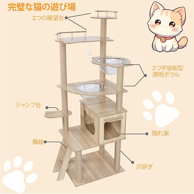 【コンパクト設計と高品質素材】高さ170cm × 幅60cm × 奥行50cm (柱直径約6.5cm) のスリム設計で、部屋の隅にもすっきり収まり省スペースを実現。この木製キャットタワーは主素材は丈夫な合板と環境に優しい天然サイザル麻ロープを使用。厳選された高品質な木材による質感ある仕上がりで。多頭飼いにも最適な広々設計、大型猫4〜5匹も同時に利用可能です。一年中安心してお使いいただけます。 【猫の好奇心をくすぐる多階層空間】この猫タワーの最大の特徴は、6段構造のユニークなデザインです。高透明アクリル製のボウル型「宇宙船ハウス」が2つ付属し、猫は中から景色を楽しめます。ジャンプスペース、複数の快適な休憩エリア、ファーボール遊び場など、遊ぶ・休む・眠る・爪をとぐといった猫の自然な行動をサポートする多様なスペースを完備。様々な高さから眺める景色は猫の好奇心と運動欲求を刺激し、運動不足解消にも最適です。 【愛猫の健康と安全を支える素材】柱には猫の爪とぎに最適な、丈夫で天然素材のサイザル麻ロープをしっかり巻き付け。ストレス解消をサポートします。製品全体は厳選された高品質な木材と無毒素材で作られており、愛猫の健康に配慮。合板は無垢材並みの安定性と耐久性を保ちながら軽量なため、移動や設置、お手入れがとても楽です。 【安心の頑丈構造と安全設計】正方形の大型ベースと12本の柱による固定構造で、抜群の安定性を実現。猫が激しく遊んでもぐらつきにくく、安全で安定した環境を提供します。さらに、すべての段の角は丸く丁寧に加工。猫が日常的にぶつかったり、飼い主様が触れたりする際のケガを防ぎ、猫にも人にも優しい設計です。 【簡単組立で飼い主様も楽々】ご自宅での組み立ても簡単です。付属の説明書と工具を使えば、約30〜40分で1人でもスムーズに完了します。分かりやすい組み立て動画もご用意しているので、初めての方も安心。愛猫が楽しそうに過ごす姿を見られる、ご自宅の新たな癒し空間を簡単に作りましょう。