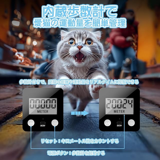 歩数計内蔵:Type-C アダプターで充電可能な正確な歩数計と内蔵ソーラーパネルを搭載し、LED ディスプレイによるリアルタイム距離追跡が可能です。これにより、猫がどれだけ運動したかを正確に把握することができます。