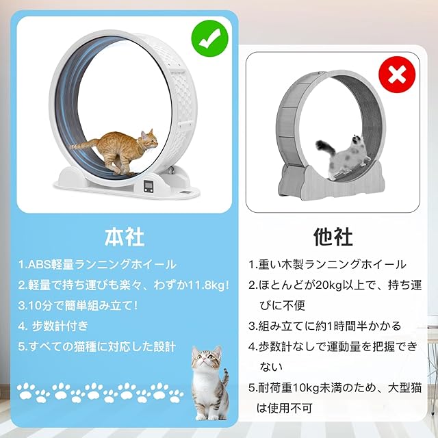 軽量かつ安定:耐久性のあるABS素材を使用しており、重量はわずか11.8kgで、従来の木製猫用エクササイズホイールよりもはるかに軽量です。広いベースと低い重心により、最も重い猫であっても、転倒したり、走行中に移動したりすることはありません。