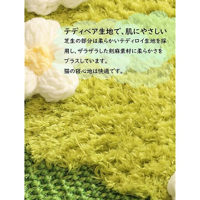 【材質】天然の剣麻材料で作られ、丈夫で爪を傷つけません。芝生の部分はテディベア生地で、柔らかいテディロイ生地を採用し、ザラザラした剣麻素材に柔らかさをプラスしています。猫の寝心地は快適です。
