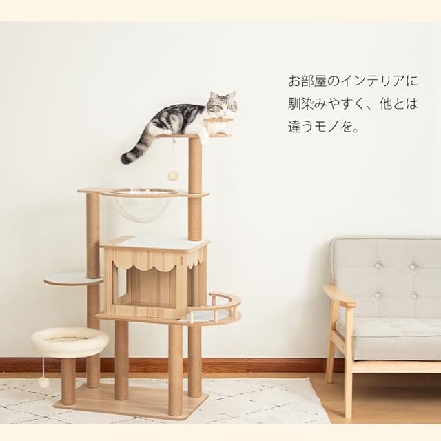 PETTIFUL キャットタワー 木製 据え置き おしゃれ シニア 大型猫 宇宙船 クリアボウル 大型 安定性高い どっしり インテリアに馴染み インテリア性高い 天然木目 大型猫