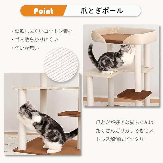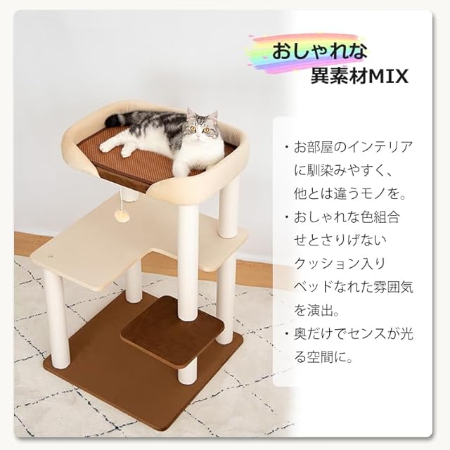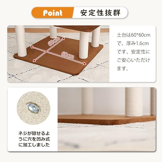 【耐久性と安定感】家具によく使用される重厚なラバーウッドを採用し、どっしりとした安定感を実現しました。猫ちゃんが勢いよく飛び降りても倒れません。手編みのカゴは内部にスチールフレームを備えているため、長年ご使用いただいても型崩れせず、安心してお使いいただけます。