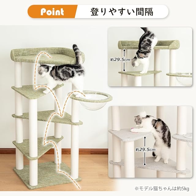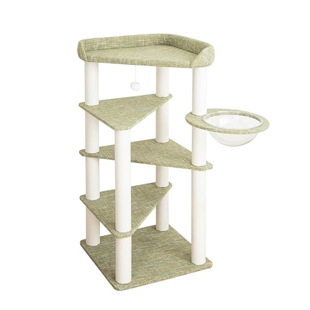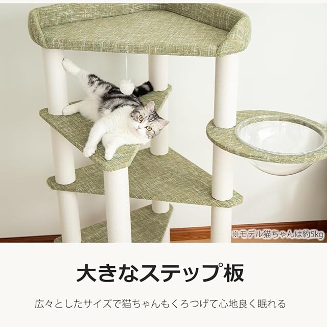 キャットタワー 据え置き 宇宙船 高さ135cm スリム コーナー 天然木 おしゃれ クリアボウル 木登り 多頭飼い 子猫 キャットツリー 猫タワー インテリア 安定感 シンプル 爪とぎ 安定 幼猫 コットン紐 コーナー適用 (オリーブグリーン)