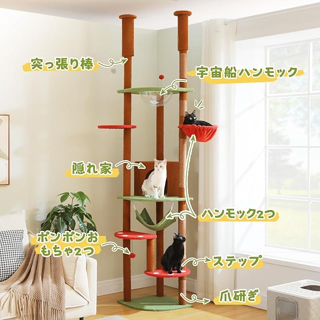 PETEPELA(ぺテぺラ) キャットタワー 突っ張り スリム ツッパリ 猫タワー 省スペース 透明 宇宙船ハンモック おもちゃ 麻紐 爪とぎ 運動不足解消 多頭飼い - ブラウン 高さ調整幅236-258cm