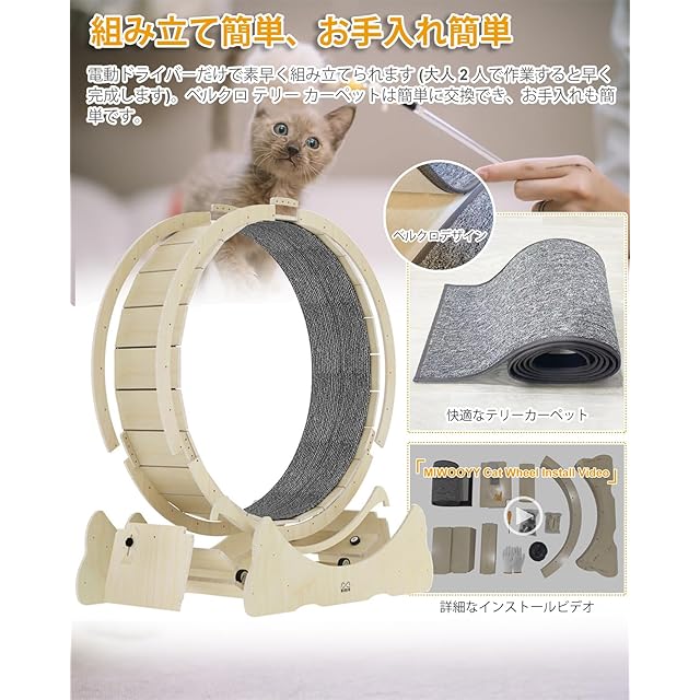 MIWOOYY キャットホイール 大型猫 回し車 110cm - 屋内猫用の天然無垢材の猫ルームランナー、ロックと最小限の隙間設計を備えた安全猫 ランニングマシン