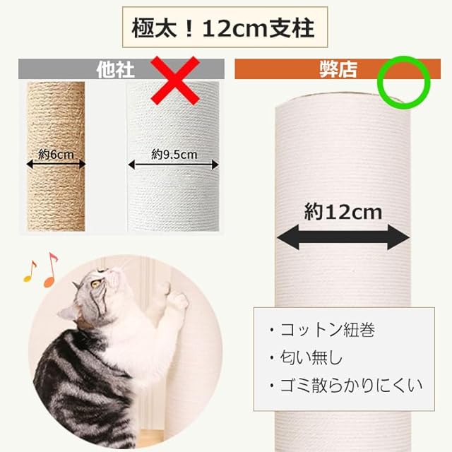 【安定性・極太支柱】コイルバネ付きの天井突っ張り構造で、しっかり固定。揺れに強く、安心の耐震仕様です。支柱は市販品よりもさらに太い直径約12cmの極太タイプを採用。大切な猫ちゃんをしっかり支えます。安全にご使用いただくため、2週間に一度ナットの緩みチェックをおすすめします。