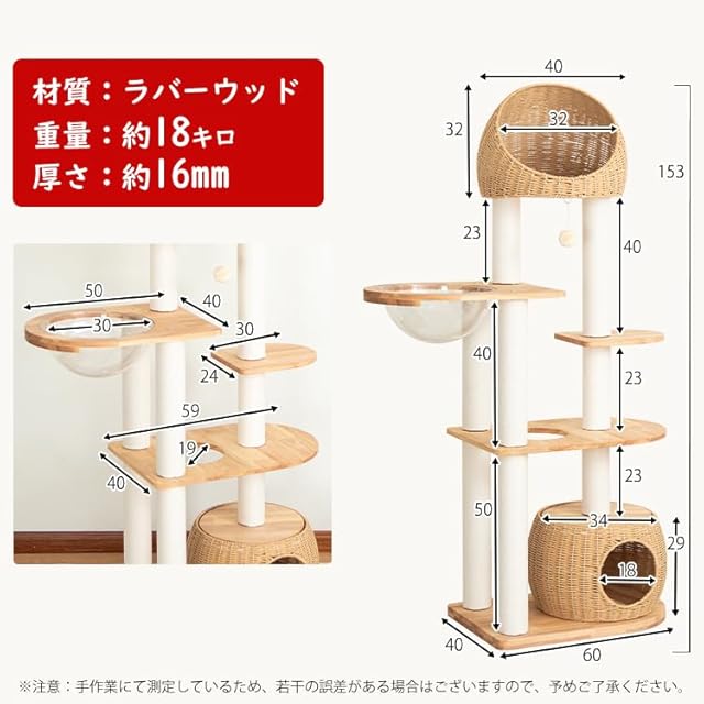 【耐久性と安定感】家具によく使用される重厚なラバーウッドを採用し、どっしりとした安定感を実現しました。猫ちゃんが勢いよく飛び降りても倒れません。手編みのカゴは内部にスチールフレームを備えているため、長年ご使用いただいても型崩れせず、安心してお使いいただけます。