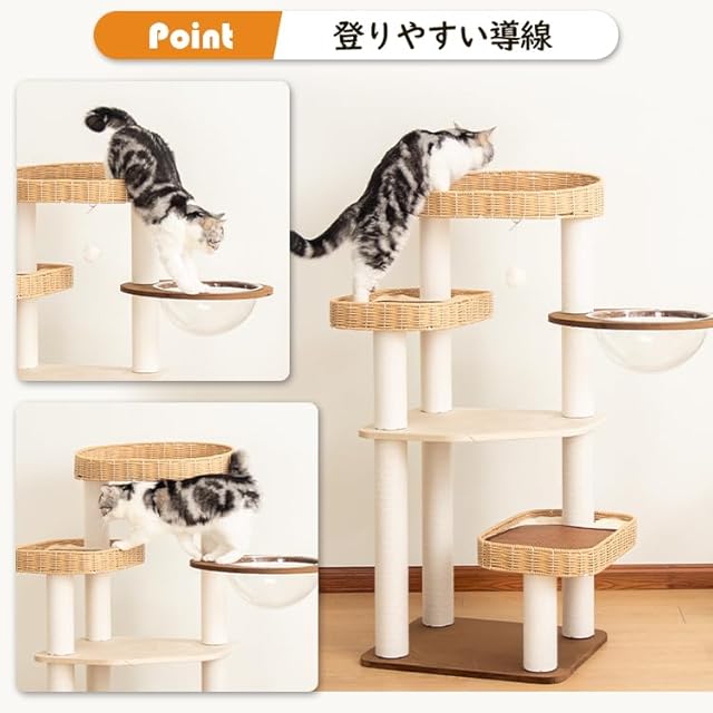 【耐久性と安定感】家具によく使用される重厚なラバーウッドを採用し、どっしりとした安定感を実現しました。猫ちゃんが勢いよく飛び降りても倒れません。手編みのカゴは内部にスチールフレームを備えているため、長年ご使用いただいても型崩れせず、安心してお使いいただけます。
