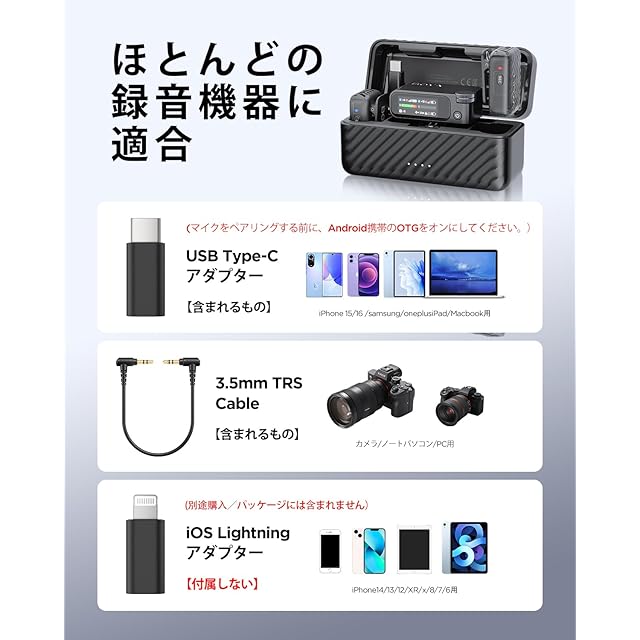 【クリエイター向け拡張性】:USB-Cアダプターと3.5mm TRSケーブル付属でiPhone16/15/Android/DSLR/配信機材に即対応。磁気クリップと防風スクリーンでプロ級性能を発揮。BOYAMIC2マイクをAndroidとペアリングする前に、携帯電話の設定でOTG機能をオンにしてください。【iPhone14/13/12/11用Lightningアダプターは別売】