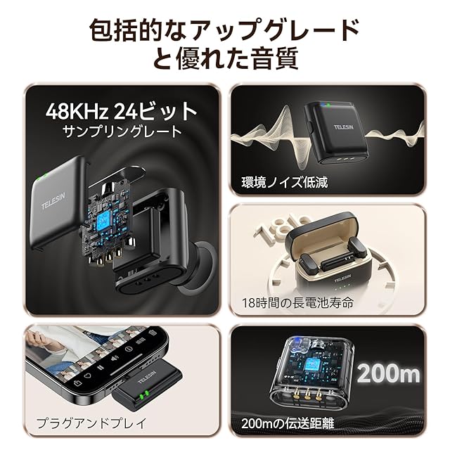 商品名:TELESIN ピンマイク ワイヤレス bluetooth 小型 オーディオ 2人同時使用 瞬時接続 18時間連続使用 ノイズ軽減 スマホ iphoneマイク 360°集音 伝送距離200m 超軽量 コンパクト iPhone/Android/PC用ワイヤレスマイク Type-C対応 Vlog撮影/ライブ配信/会議/TikTokなど大活躍