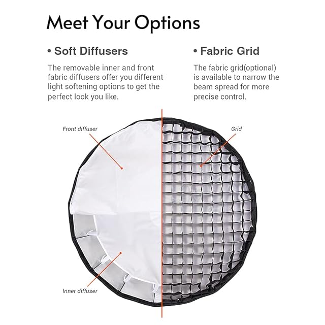ソフトディフューザー取り外し可能なインナーとフロントのファブリックディフューザーは、さまざまな光軟化オプションを提供して、好みの完璧な外観を実現します。·ファブリックグリッドファブリックグリッド(オプションを使用して、ビームの広がりを狭めより正確な制御を実現できます。