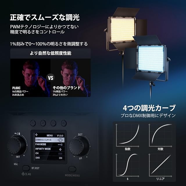 【静音冷却&安定出力】PL60C RGB LEDスタジオライトは全金属ボディで作られ、デュアル静音ファンも含まれ、効率的な放熱を実現し、高出力でもノイズを低減し、長時間使用に最適です。スマート/ミッド/ミュートモードを選択でき、録画中でも色温度と明るさブレを防ぎ、ちらつきも防止し、長時間動画撮影、生放送でも安定した光量をします。