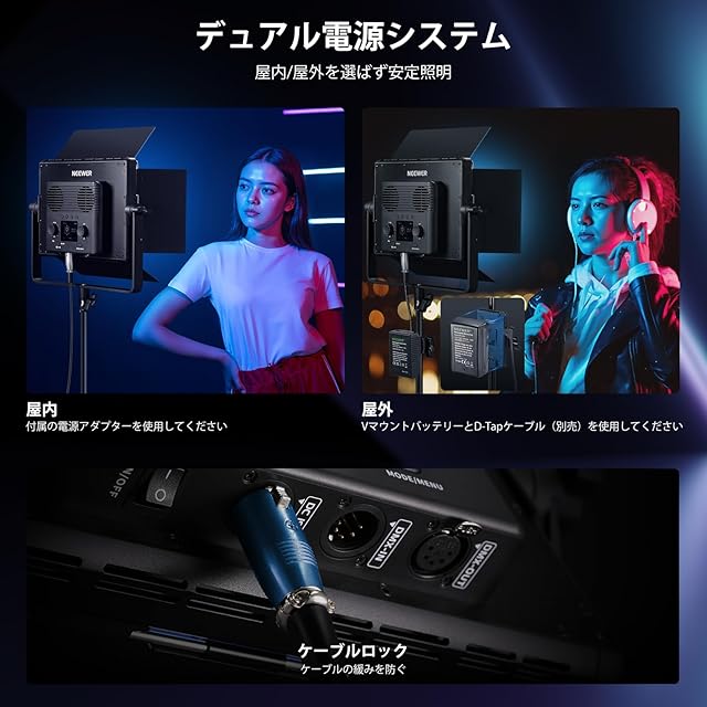 【デュアル電源対応&ケーブルロック】RGB LEDビデオライトは電源アダプター(日本規格プラグ)が付属しており、AC電源で給電を提供し、連続的なビデオ照明をします。Vマウントバッテリー(バッテリーとDタップケーブルは別売)でライトに電力も供給し、屋外撮影を簡単になります。DCポートはケーブルロック付きで、接続外れを防止し、コンパクト設計でロケ撮影、野外配信にも最適です。