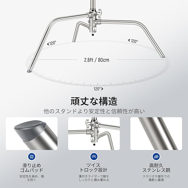 【NEEWER BASICSシリーズ】NEEWER BASICSシリーズは、シンプルで実用性に優れたシリーズで、基本的な機能と設計に基づいて、不要な追加機能や素材がありません。SC320 Liteはステンレス製の頑丈なCスタンドで、頑丈なブームアームと2つのグリップヘッドを装備しており、様々な重い撮影機材をしっかりと固定でき、様々な設置や効果を適用します。金属製タートルベースは、ぐらつくことなくしっかりと支えます。