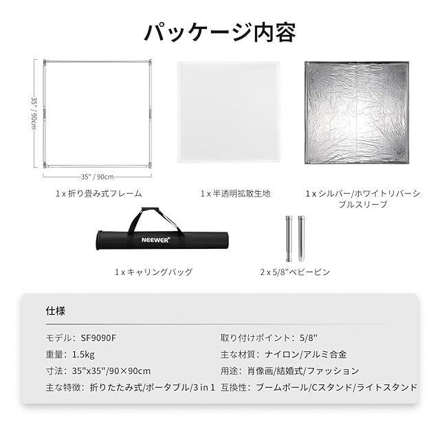 商品名:NEEWER 撮影用レフ板 光拡散パネルスクリムキット サンスクリム反射板 シルバー/ホワイト反射板フィルム/5/8"ベビーピンハンドル付き 90x90cm 折り畳み式フレーム Cスタンド用3in1ディフュージョン スタジオ/肖像/写真/商品撮影用 SF9090F