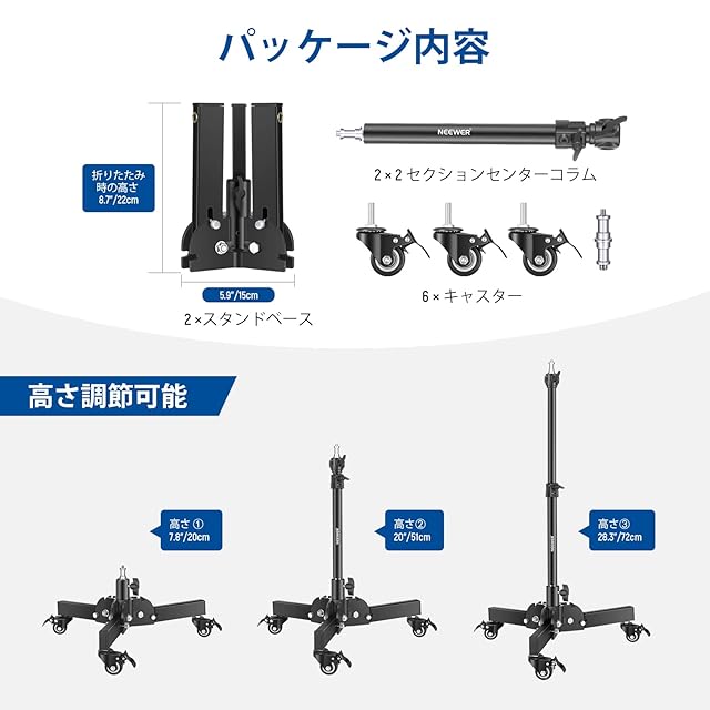 <br><br><b>商品説明</b> <br>ご注意:キャスターは使用前に取り付けてください。 <br>センターコラムの調整範囲は14.5"~22.8"/37~58cmです。耐久性と取り外し可能ベースは金属素材で作られており、22lb/10kgまでの負荷に耐えられるよう、より安定性と強度を高めています。 <br>照明を上、左、右からこのスタンドに取り付けることができる3ウェイスタンドヘッドが付属し、より柔軟に使用できます。 <br>耐摩耗性、耐衝撃性、耐久性に優れた3つの回転式金属キャスターを装備し、スタンドを安定して動かします。 <br>スタジオ撮影用のバックグラウンドライトスタンドやローアングルライトスタンドとして使用できます。 <br><br><b>仕様</b> <br>最大高さ(プーリー付き):28.3"/72cm <br>最小高さ(プーリー付き):7.8"/20cm <br>チューブ径:25-22mm <br>最大耐荷重:22ポンド/ 10kg <br>重量:6.5ポンド/2.98kg <br><br><b>パッケージ内容</b> <br>2×スタンドベース <br>2 x センターコラム (2セクション) <br>6×キャスター