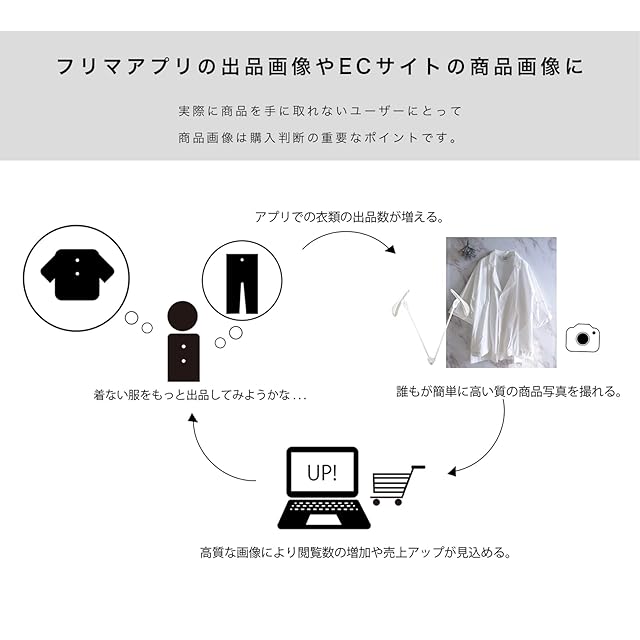 《特徴》 1.透明紐がついており、壁やラックに吊るしてご利用いただけます。 2.ハンガー本体の部分が服の中に隠れる形状になっている為、撮影時に写りこみが無く、撮影後の画像加工の手間がかかりません。 3.平置きでの撮影に比べて、自然で立体的に撮影が可能です。 4.洋服のサイズに合わせて、サイズ変更が可能です。