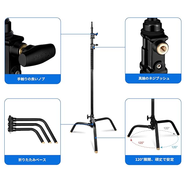 商品名:Selens Cスタンド センチュリースタンド 3.9-8.8ft/130cm-295cm 高さ調節可能 耐荷重 ステンレス製 折りたたみ式 撮影用 ヘビーデューティライトスタンド 撮影スタジオ ソフトボックス アンブレラ モノライトなど対応 ブラック