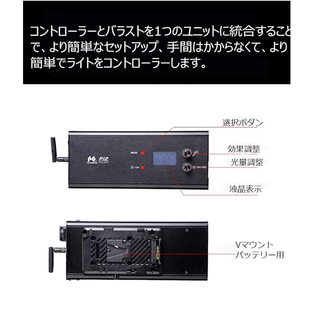 Falcon EyesのPULSARシリーズP12は、非常に耐久性があり、軽量なCNCアルミニウムハウジングで構築されており、屋外での撮影には非常に適しています。また、繊細なコントロールボックスには、LCDタッチスクリーンコントロールが付属しています。