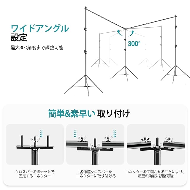 【大型背景スタンドセット】より安定し、スタンドの底部にはスプリングが設置されており、高さを調整して落下する際に発生する可能性のある損傷を避けるためます。2つのアルミニウム合金構造の専門のクロスバーを備えて、3つの部分で構成して、クロスバーコネクターによる接続サイズ調節可能:高さ 131cm-304cm、幅 120cm~609cm、最大負荷容量:16kg。