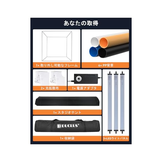<b><p>商品名 </b> DUCLUS 撮影ボックス 写真 100cm-商品・静物撮影に最適<br></p> <p>この100cm大型撮影用ボックスは、プロ仕様の商品撮影用に設計されており、コンパクトで持ち運び可能なセットアップでスタジオ品質の照明を提供します。Eコマース販売者、フォトグラファー、コンテンツクリエイターなど、この完全なキットは、魅力的な画像に必要なすべてを提供します。</p> <b><p>✅ 超大型の撮影スペース</b><br> ライトボックスは100cmの内部を備えており、高さ80cmまでの製品を快適に撮影できます。商品撮影、フードスタイリング、ジュエリー、電子機器、その他の静物撮影に最適です。</p> <b><p>✅ プロフェッショナル照明システム</b><br> 210個の高輝度LEDビーズを搭載したこのライトボックスは、10500ルーメンのちらつきのない5600Kの自然な白色光(CRI>96)で、忠実な色精度を実現。反射率の高いシルバーの内装と2枚のディフューザークロスにより、ソフトで均一な照明を実現し、厳しい影を作りません。</p> <b><p>✅ 完全な照明制御</b><br> <b>0-100% 無段階調光 </b><br> <b>3x 360°回転式LEDパネルトップ/フロント/サイド/バックライト用</b><br> <b>マルチアングル撮影</b> (前面窓+上面穴+マクロ窓)<br> </p> <b><p>✅ 4つのプロフェッショナルな背景が付属</b><br> 4つの耐久性のあるPPマット背景(白/黒/ライトオレンジ/青)を入手 - しわになりにくく、防水で、お手入れが簡単です。PVC(反射が少ない)や紙(耐久性が高い)よりも優れています。 <b><p>✅ オールインワンキットの内容:</b><br> <br>1 x スタジオテント <br>3 x LEDライトパネル<br>4 x PP背景<br> 12 x ステンレス鋼管<br> 10 x プラスチックコネクタ <br> 1 x 穴のない光拡散布<br> 1 x 穴と光拡散布 <br>1 x プラグ付き調光器 <br>1 x 使用説明書<br>1 x 収納袋</p>
