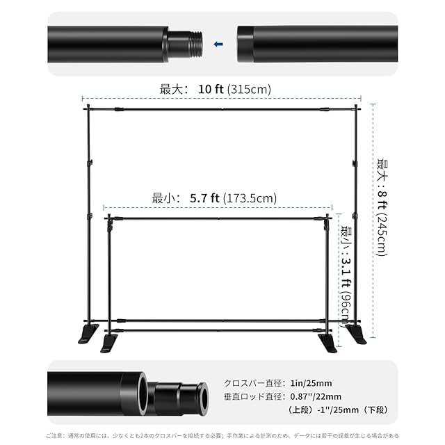 【調整可能な高さと幅】調整可能な背景フレームは4本の取り外し可能なクロスバー(上部2本、下部2本)と2本の伸縮式延長ボールを備え、クロスバーを追加や減算することで、容易に幅5.9ft/180cmから9.8ft/300cmに調整でき、簡単なひねりでも高さを3.2ft/98cmから8ft/245cmに調整できます。