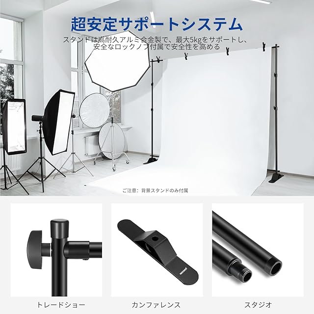 <br><br><b>*商品説明:</b> <br>10 x 8ft/3.1 x 2.4 m背景スタンドはプレミアムアルミニウム合金で作られており、2つの幅広げ金属ベースを備えており、最大5 kgまでの比類のない安定性を持ちます。 <br>取り外し可能なクロスバーと伸縮式延長ポールを使用して、背景を簡単にカスタマイズできます。 幅5.9ft/180cmから9.8ft/300cmまで、3.2ft/98cmから8ft/245cmまで簡単に調整できます。 <br>クロスバーと延長ポールを組み立てる簡単なひねりで、数分でセットアップできます。 追加の工具は必要ありません。 <br>4 つの強化されたスプリング クランプが背景を所定の位置にしっかりと保持し、さまざまな厚さに対応します。 <br>キャリングバッグに収められ、保管や持ち運びが簡単です。 <br><br><b>*仕様:</b> <br>モデル:NK-ST300 <br>アイテムタイプ:背景スタンド <br>互換性:バックドロップ <br>用途:スタジオ/パーティー/結婚式/ポートレート <br>主な特徴:裾野の拡大と柔軟な用途 <br>取り付けポイント:クランプ <br>材質:アルミニウム合金 <br>重量:6kg <br>耐荷重:5kg <br>寸法:10 x 8ft / 3.1 x 2.4m <br><br><b>*パッケージ内容:</b> <br>2×背景ベース <br>4×クロスバー <br>2×延長ポール <br>4×スプリングクランプ <br>1×ユーザーマニュアル <br>1×キャリングバッグ