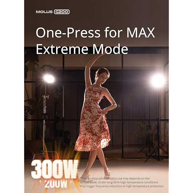 【最大300W】ZHIYUN MOLUS G200は、通常使用で最大200Wのピーク出力を誇り、ワンプッシュによる最大エクストリーム(MAX Extreme)モードでは{最大300Wの驚異的なピーク出力を提供します}。