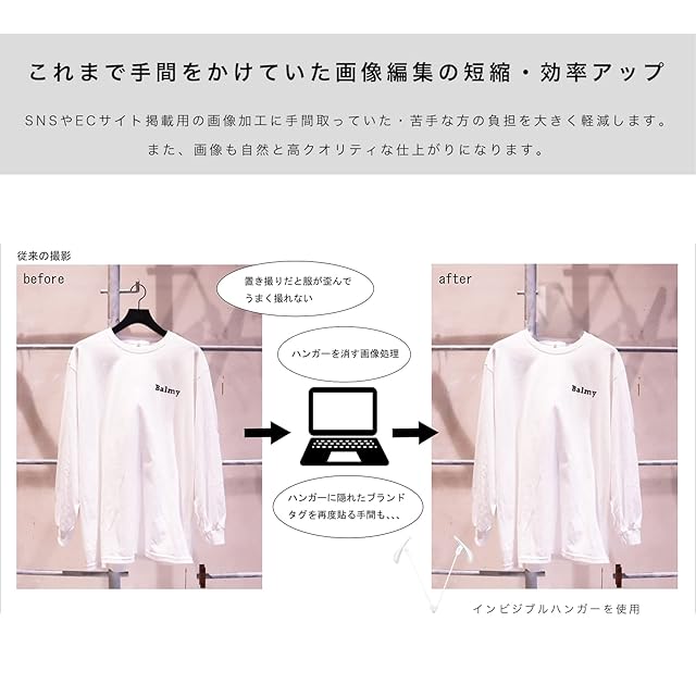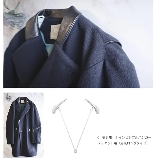 《特徴》 1.透明紐がついており、壁やラックに吊るしてご利用いただけます。 2.ハンガー本体の部分が服の中に隠れる形状になっている為、撮影時に写りこみが無く、撮影後の画像加工の手間がかかりません。 3.平置きでの撮影に比べて、自然で立体的に撮影が可能です。 4.洋服のサイズに合わせて、サイズ変更が可能です。
