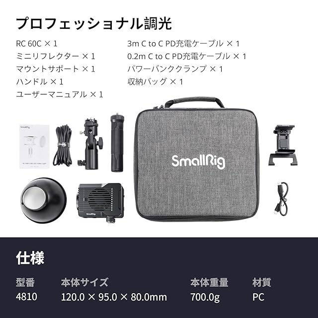 【同梱物】RC 60C x 1、ミニリフレクター x 1、サポートコラム x 1、ハンドル x 1、3m C to C PD充電ケーブル x 1、0.2m C to C PD充電ケーブル x 1、パワーバンククランプ x 1、収納バッグ x 1、取扱説明書 x 1