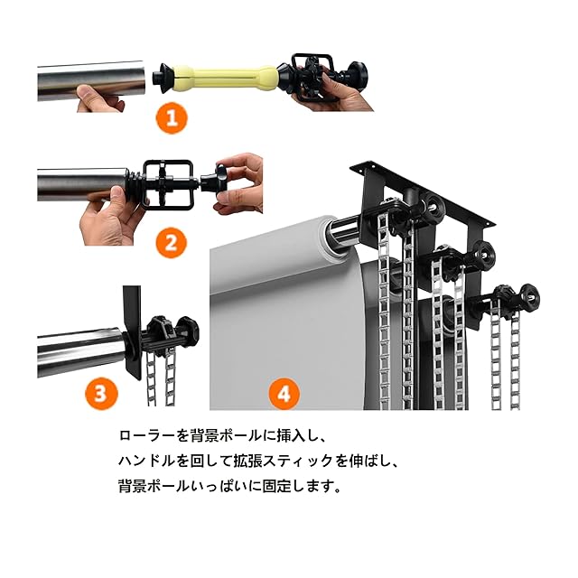 万能キット:ローラー6個、ブラケット2個、ライトスタンドアダプター2個、チェーン3個、カウンターウェイト3個、背景幕を上げ下げするための118インチ/3mのステンレススチールチューブクロスバーアセンブリ、背景紙、写真用クロス、PVCクロスが含まれています。 小さなスタジオやホームスタジオの背景マウントに最適です。