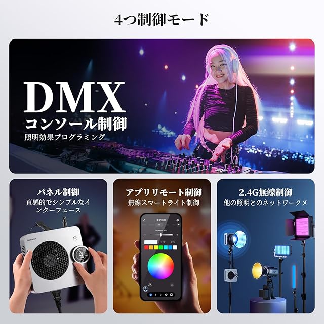 【DMX/APP/2.4G/パネル制御】HS200C スタジオライトはNEEWER専用アプリと連動し、Infinityテクノロジーを使用すれば、スマートフォンアプリからの無線遠隔操作が可能です。2.4Gモードを切り替え、同一チャンネルで複数のLEDライトを同期させ、グループ制御も可能。付属のDMXケーブルでDMXコンソールに接続すれば、よりプロ仕様の照明制御システムも構築できます。直感的なカラーディスプレイを搭載したコントロールパネルで、手軽に設定調整が可能。