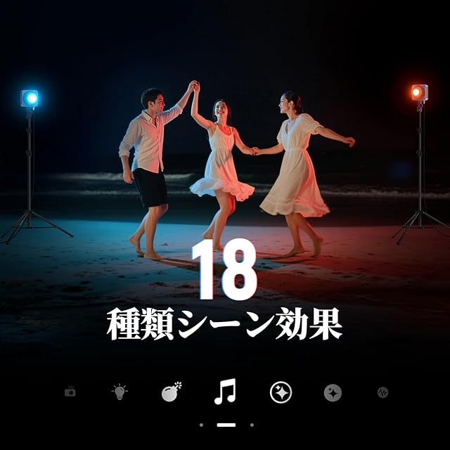 【7照明モード&18シーン効果】HS200C 撮影ライトは、CCT/HSI/RGBCW/XY/GEL/SOURCE/FXの7つの照明モードを搭載。豊富な色表現で、創造性を広げます。FXモードには18種類のシーン効果を内蔵。SOURCEモードでは17種類のプリセット光源を即座に呼び出せます。HSIモードでは、0–360°のカラーホイール、0–100%の彩度と明るさを細かく調整可能。さらに、4種類の調光カーブ(リニア、Sカーブ、対数、指数)を搭載し、プロ仕様の精密な光制御を実現。写真撮影から動画収録まで、こだわりの照明効果を簡単に実現できます。