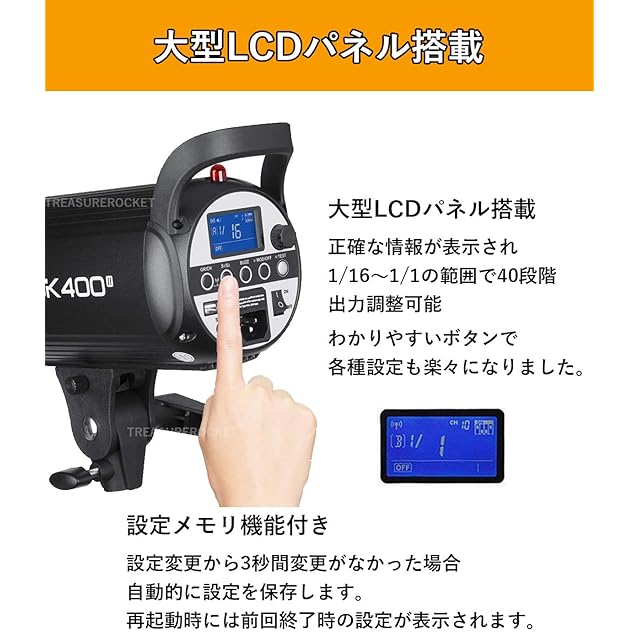 ◆【Godox SKシリーズの最新版】 Godox 2.4G ワイヤレスXシステム内蔵の SK400II は、安定した出力と高い操作性を兼ね備えています。モデリングランプは150Wとハイパワーで、5%から100%間で調整可能です。旧シリーズよりもリサイクルタイムが 速くなり、より撮影効率を向上できます。便利な設定メモリー機能が付いているため、スムーズに撮影ができます。