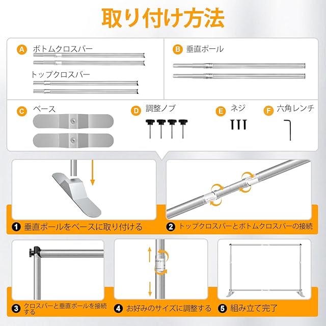 【自由にサイズ調節可能】伸縮式スタンドのデザインによって、ポールのジョイントを回転させて固定するだけで、幅と高さを自由に調節できます。(調整範囲:高さ:103cm~240cm、幅:188cm~300cm)さまざまな場合は柔軟に対応します。
