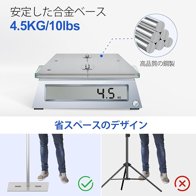 【プロ品質】メタルベースは高品質の合金製で、構造全体をより安定させ、揺れを少なくします。 平らなベースは三脚よりも安定していてスペースを節約します。 クロスバーの設計で長さを自由に調節でき、時間と労力を節約します。