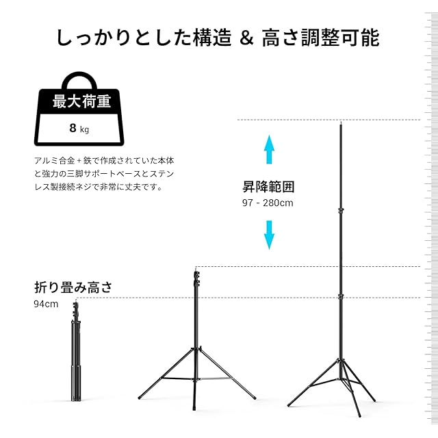 【調節・折りたたみ】高さ調節に便利な三脚スタンドです。 高さは94cmから280cmで、さまざまなシナリオに適しています。 折りたたんだ長さはわずか94cmで、効率的なフリップオン/オフロック、コンパクトな収納サイズ、持ち運びに便利です。