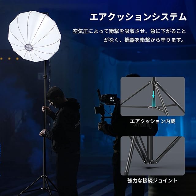 【エアクッションデザイン】SmallRigライトスタンド3737はエアクッションデザインを採用しており、高さ調整時の設置機器の急激な落下によるライトのダメージや指の挟み込みを軽減し、安全性と安定性を確保しています。