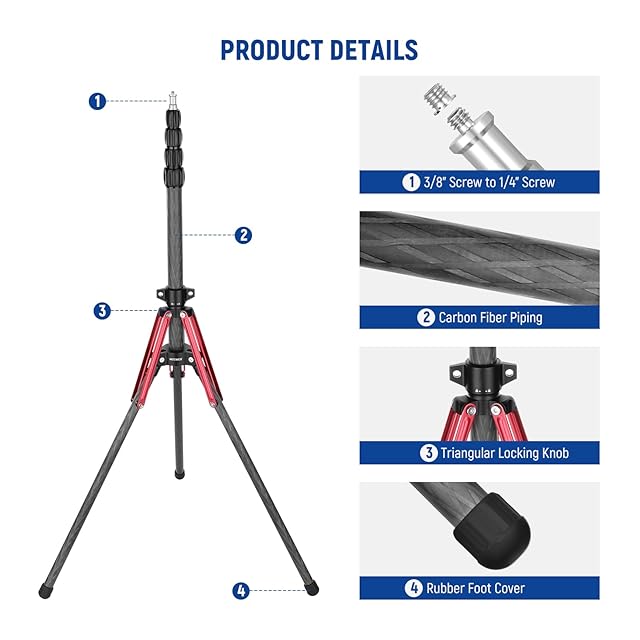 【より厚く強力なカーボンファイバー構造】NEEWER ST210R三脚スタンドは丈夫で軽量なカーボンファイバーで設計されており、9層のピュアキャブレターで作られた厚みのあるカーボンファイバーと最大耐荷重7.7ポンド/3.5kgを特徴としています。軽量で持ち運びが容易で、傷や腐食、さらには熱や凍結などの厳しい作業条件にも耐えることができます。ゴム製のフットカバーが摩擦を加えて安定性を高めます。