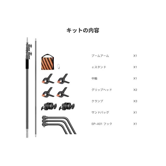 【パッケージ内容】C-スタンド*1、中轴*1、ブームアーム*1、グリップヘッド*2、サンドバッグ*1、強力クランプ *4(12ヶ月のメーカー、24時間のカスタマーサービス。製品に不具合が生じた場合、弊社にご連絡いただければ、迅速に対応いたします。)