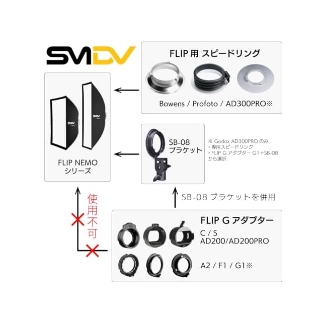 【ストロボへの取り付けには】別売のFLIP/FLIP NEMO対応のアダプター(Profoto,Bowens,Godox AD300Pro対応品)各種、クリップオンストロボの使用にはSB-08ブラケット+Flip Gシリーズ用アダプター(各社対応品)を組み合わせてご使用ください。