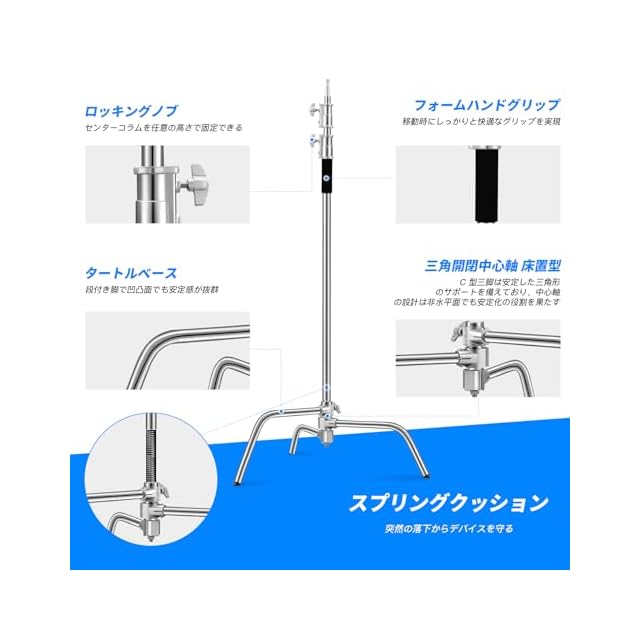 【セット内容】C-スタンド本体(足と支柱)x1、ブームアームx1、グリップヘッド(タボ)x2、サンドバッグx1、強力クランプX3。一年メーカ―。