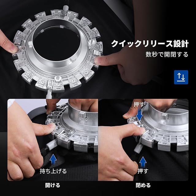 【折りたたみ可能&幅広い用途】折りたたみ式ソフトボックスは折りたたむと (72 x 19 x 19cm)、メッシュポケットが付いたキャリングバッグに簡単に収まります。結婚式、パーティー、ポートレート、商品写真、ファッション撮影などに最適です。壁または天井マウント (別売) を使用すると、あたかも被写体の上の高い窓から光が差し込んでいるかのように、より広い空間のような錯覚を生み出します。