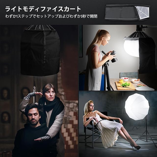 【360°全方位バランスライト】この26"/65cmの NEEWERランタンソフトボックスは、正方形や放物線状のソフトボックスと比較して広くて、バランスが取れており、影のない360°の光をカバーし、ビデオ録画、ライブ ストリーミング、インタビューに最適です。4枚フラップのスカートはタッチファスナーで着脱できるので、フラップの数を選んで光の形や向きを自在にコントロールできます。