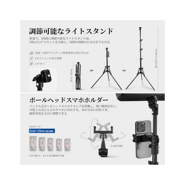【調節可能なライトスタンド&スマホホルダー】3段伸縮式三脚スタンドは最大150cmまで高さ調節可能。1/4インチボール雲台を搭載し、180°垂直チルト&360°水平回転で多様なアングルを実現。折りたたみ時43cmのコンパクト設計で収納・持ち運びもに便利です。付属のスマホホルダーは360°回転可能で、6~10cm幅の端末に対応。動画コンテンツ制作に最適です。